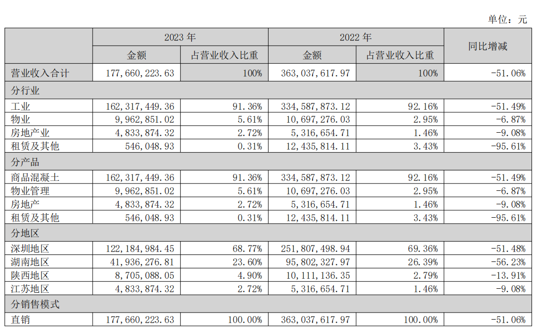就其营收构成来看,商品混凝土仍是最主要业务来源,2023年该业务营收占比高达91.36%,其余则为物业管理、房地产、租赁及其他业务。